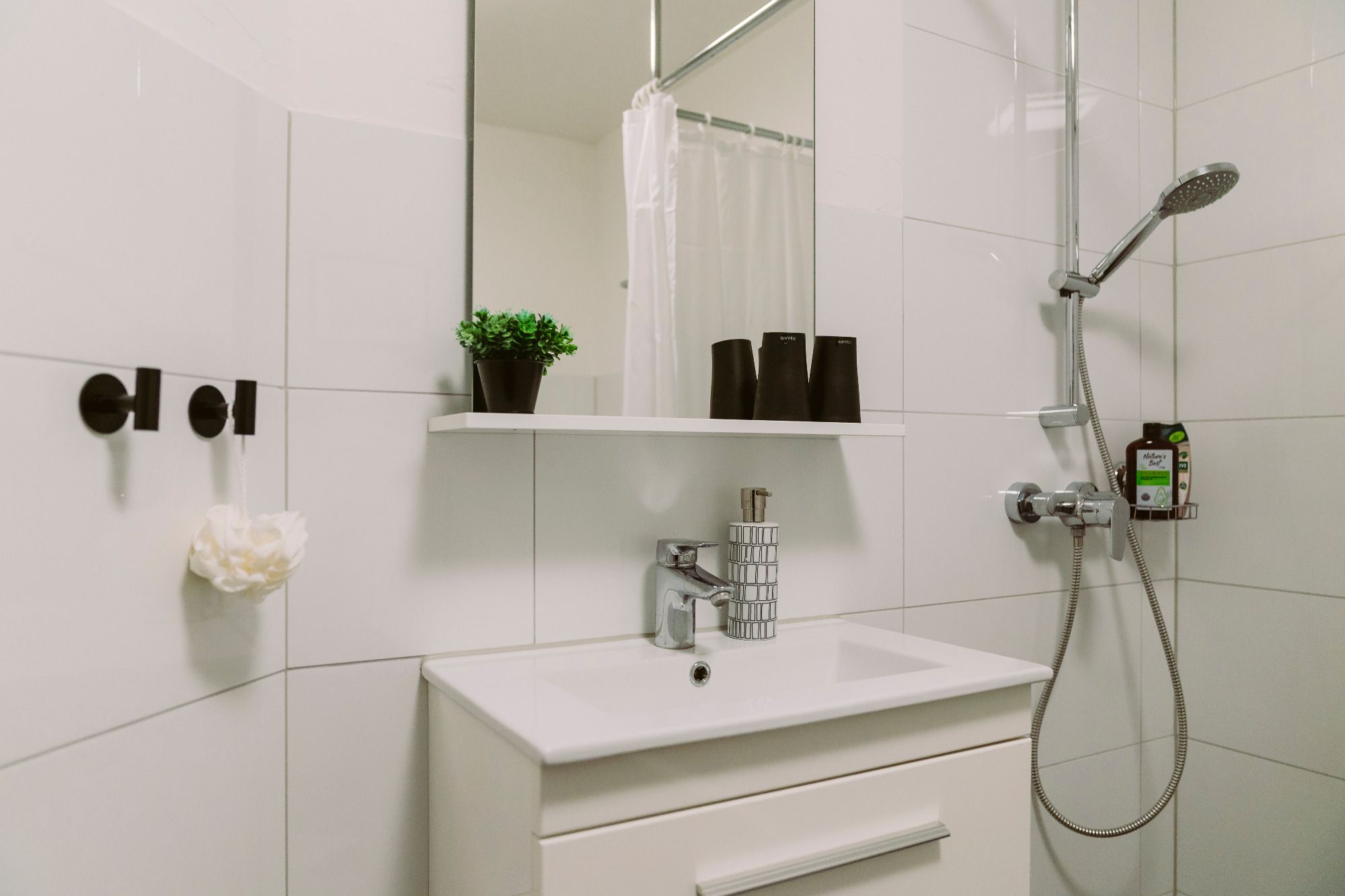 Es steht eine bodentiefe Dusche zur Verfügung, eine Badewanne und natürlich eine Toilette (hygienisch ohne Spülrand). Im Bad findest Du einen sehr leisen Waschtrockner mit Kurzprogramm, Waschmittel, Handtücher, Nature-Duschgel, Shampoo und einen Fön.